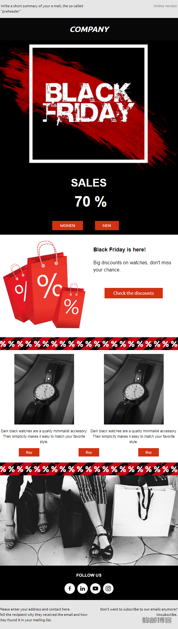 而这样的购物狂欢节,作为跨境电商从业者的我们又怎么能错过这个销售的好机会呢!因此下面这款邮件模板我十分推荐各位使用!这款模板以传统的黑色、红色作为主色调,在色彩上就让顾客知道这是一封关于黑色星期五的邮件。