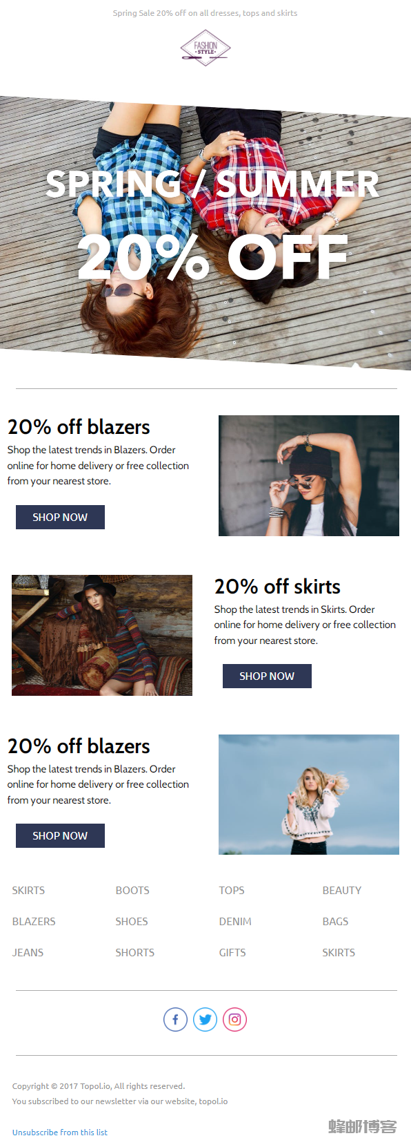 主打的就是“直接”,在邮件开头就以巨大的标题冲击客户的视觉,直接告诉客户“春夏季服装打!八——折——!”。在每个模块内展示服装,然后并放上官网的链接。让客户感受到我们的真诚,不玩套路,就是直接打折!
