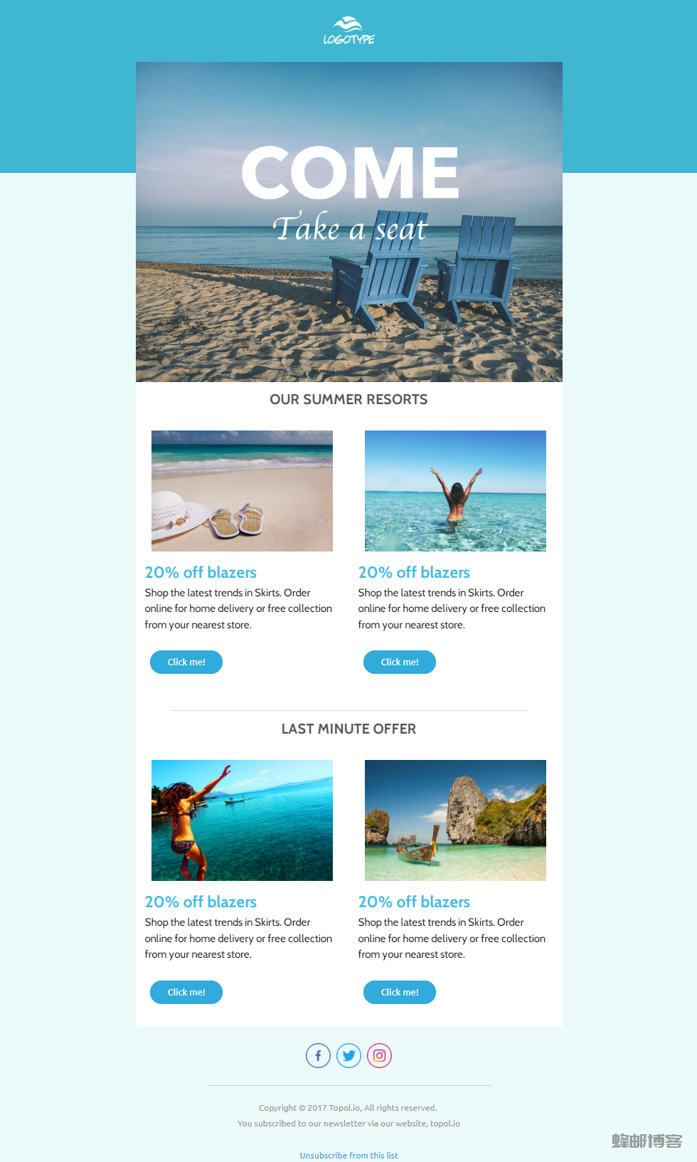 在邮件开头,友好地邀请客户过来一起坐坐。背景是一片大海和蓝天,工作疲劳的客户可以在这里享受夕阳和爱人的美好时光。这种美好的氛围直观地呈现给客户,让他们重新燃起对未来生活的向往,而你们的产品是客户所向往的。在正文部分,告诉客户有八折优惠,让他们立刻下单订购。所以,现在购买更划算,不要再犹豫了!